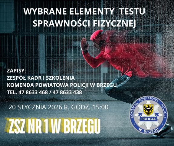 Brzescy policjanci zapraszają wszystkich zainteresowanych służbą w Policji na wybrane elementy próbnego testu sprawności fizycznej, który odbędzie się 20 stycznia br. o godz. 15:00 w hali sportowej Zespołu Szkół Zawodowych nr 1 im. Marii Skłodowskiej-Curie w Brzegu. Instruktorzy chętnie udzielą pomocy i odpowiedzą na wszelkie pytania, aby pokonać go bez żadnych trudności.