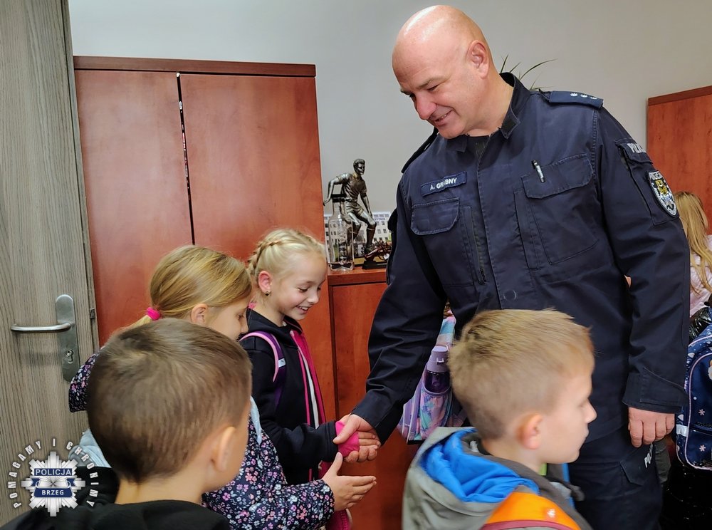 Oprócz rozmów o bezpieczeństwie nasi goście mieli okazję zapoznać się z codziennością w mundurze. Dzieci mogły wsiąść do radiowozu, zobaczyć jak wygląda policyjna strzelnica i jak wygląda stanowisko kierowania. To miejsce gdzie oficer dyżurny przyjmuje zgłoszenie i przekazuje interwencje do zrealizowania dla policjantów. Wszyscy mieli okazję przywitać się z I Zastępcą Komendanta Powiatowego Policji w Brzegu kom. Andrzejem Grabnym i Zastępcą Komendanta Powiatowego Policji w Brzegu podinsp. Damianem Więckiem. Komendanci przybliżyli naszym gościom na czym polega być szefem jednostki Policji i podkreślili jak odpowiedzialna to praca.