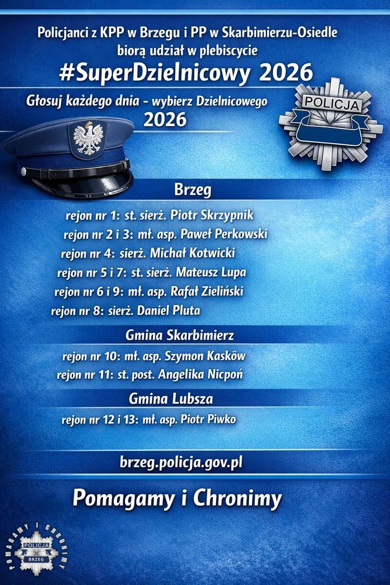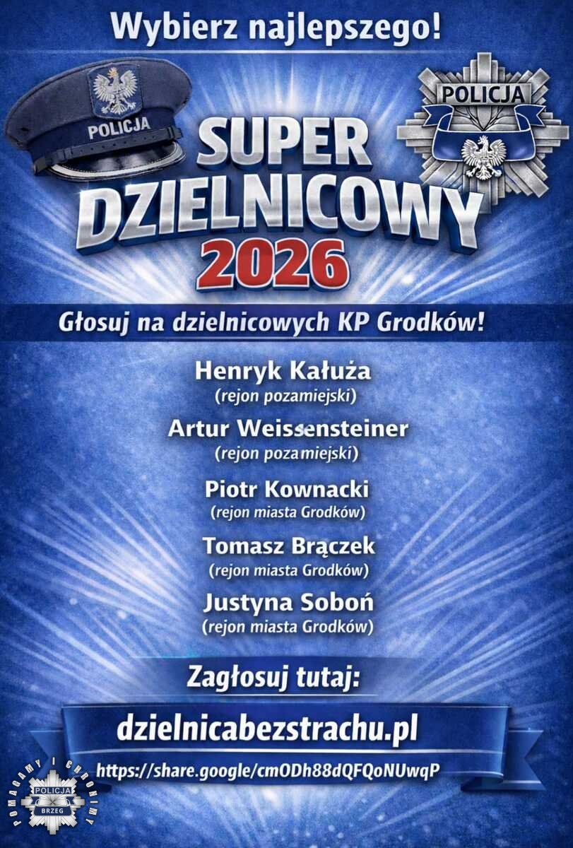 To służba wymagająca i warta docenienia. W tym roku obchodzimy jubileusz 100-lecia służby dzielnicowych w Polskiej Policji. W jego świetle zachęcamy do wzięcia udziału w konkurs #SuperDzielnicowego 2026 trwa. Dlatego zgłoś swojego kandydata lub kandydatkę w formularzu zgłoszeniowym dostępnym na stronie https://dzielnicabezstrachu.pl. Pamiętaj! Jeśli chcesz walczyć o nagrodę, za pierwszym razem musisz uzasadnić swoje zgłoszenie, a następnie możesz oddawać głosy na swojego kandydata raz dziennie przez cały okres trwania akcji.